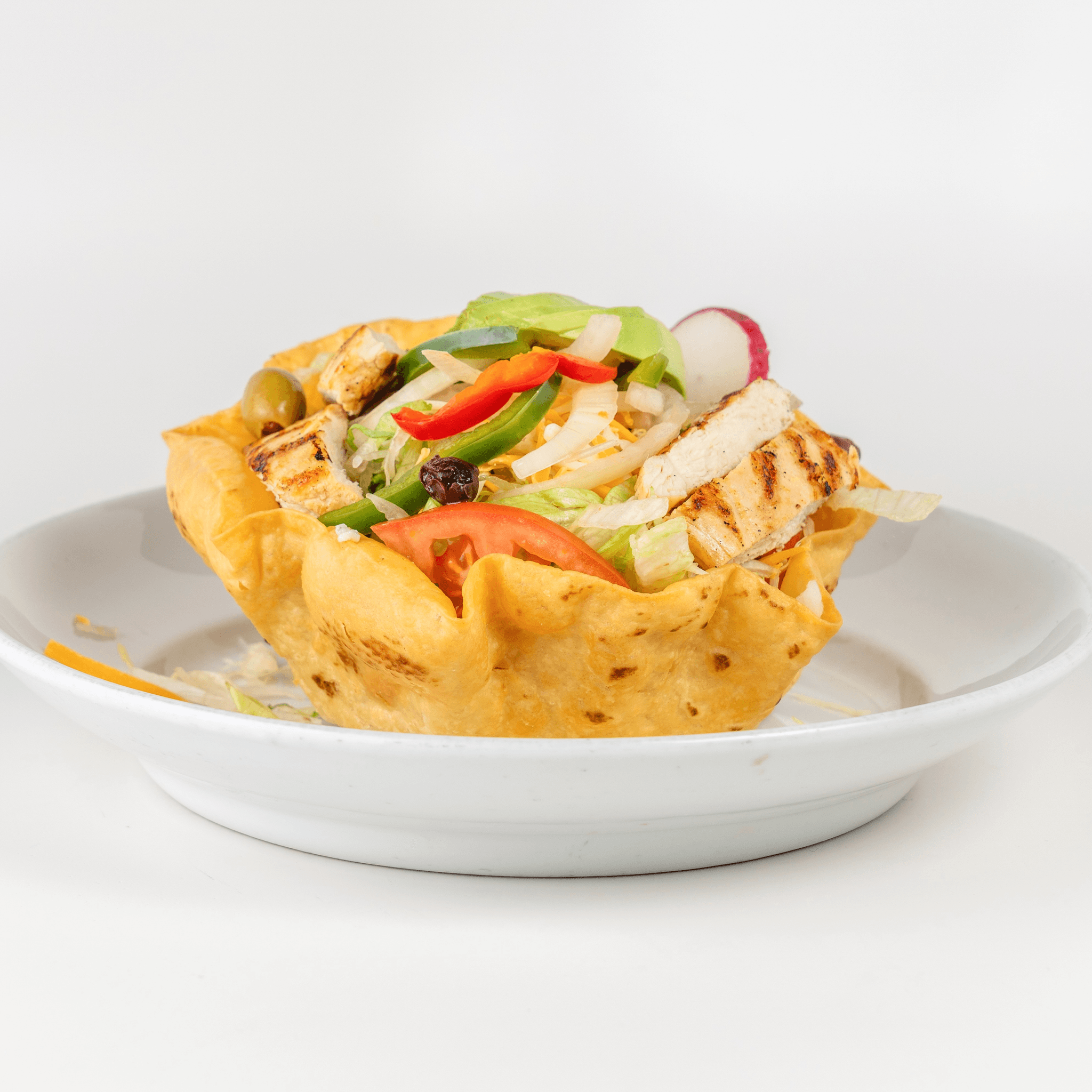 Iceberg lettuce, onions, peppers, shredded cheese, olives, avocado, choice of grilled chicken or ground beef over a fried tortilla bowl