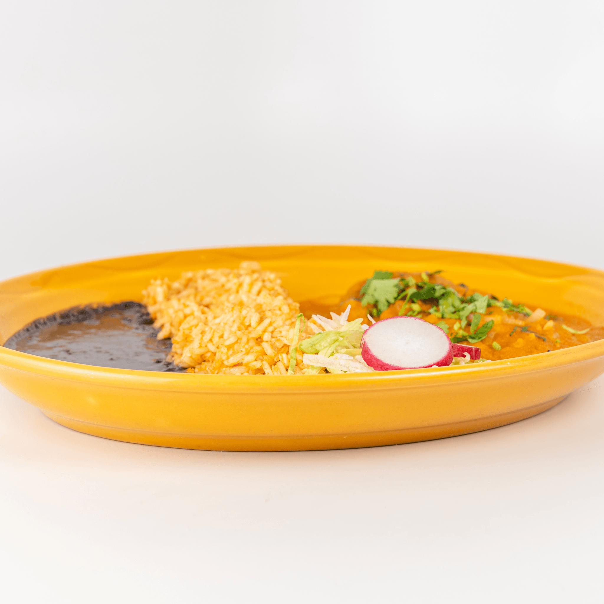 Soft corn tortillas rolled with pulled pork, topped with guajillo pepper sauce, cotija cheese, and sour cream