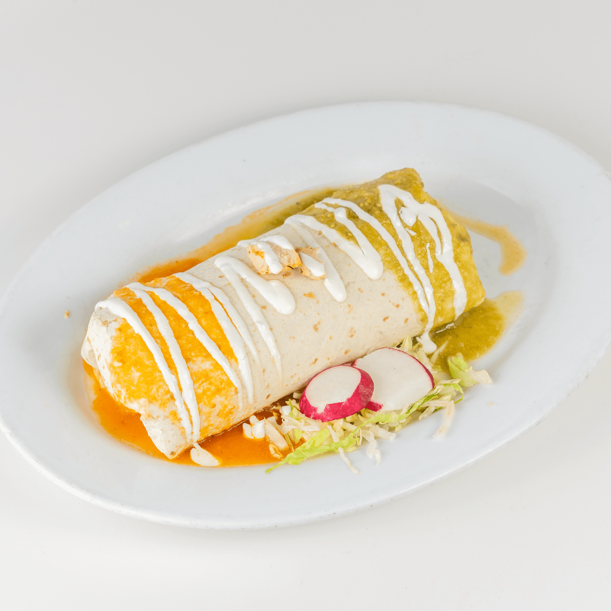 Grilled large flour tortilla rolled with either grilled chicken or grilled steak, along with Mexican rice and black beans, guacamole, and lettuce, topped with melted cheese, sour cream, red & green sauce. Served with soup or salad