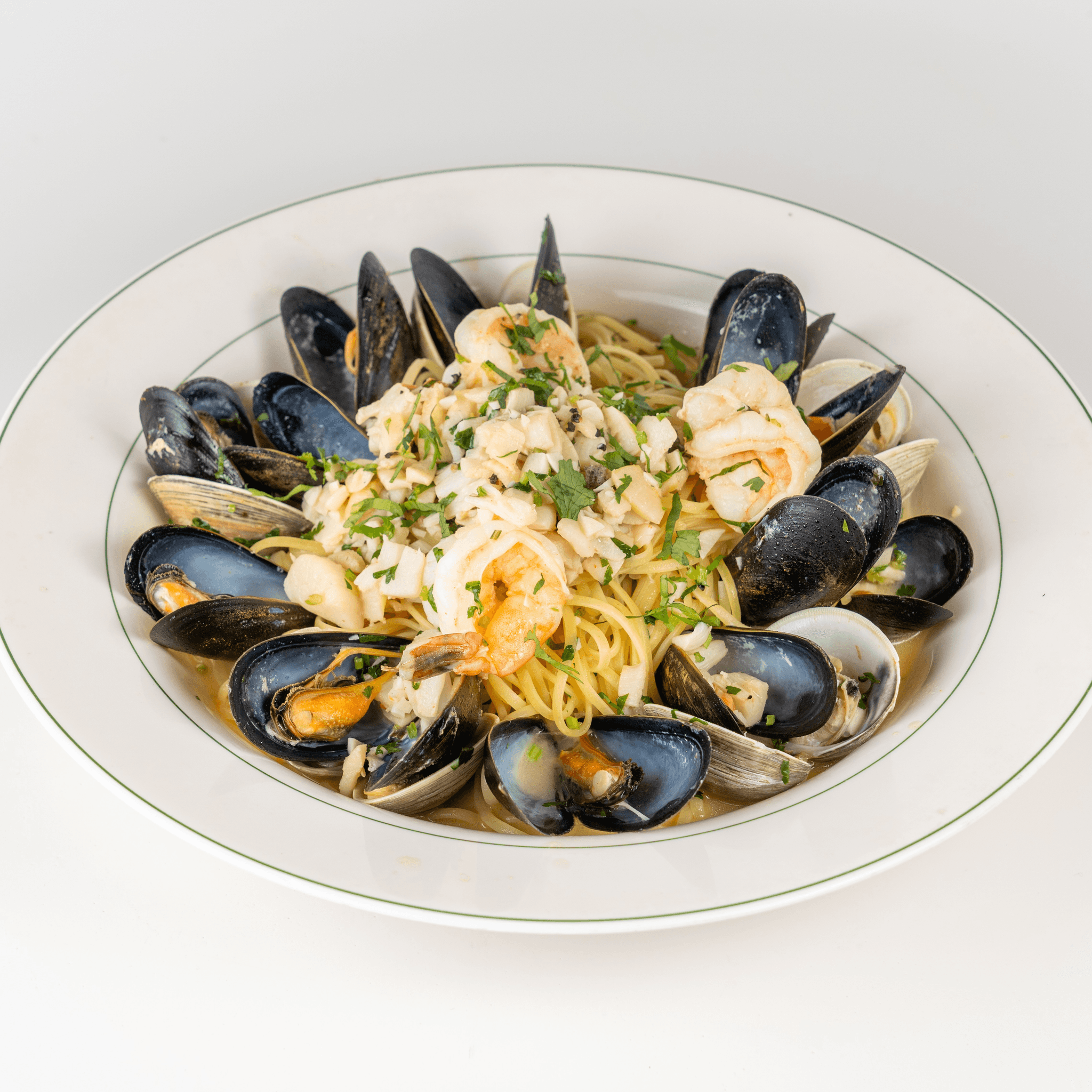 Clams, mussels, shrimp & scallops in a mild garlic sauce over linguine
