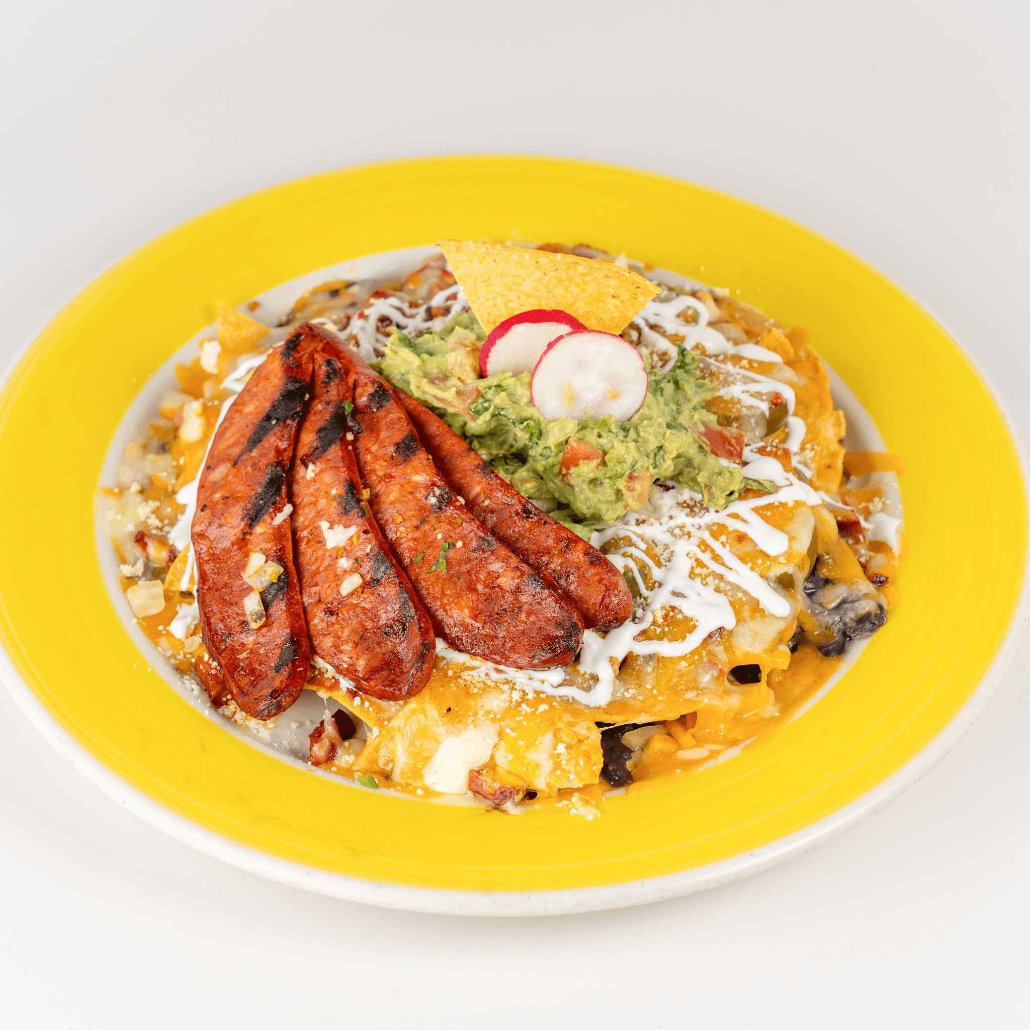 Tortilla chips with refried beans, chorizo, melted cheese, pickled jalapeño, sour cream and guacamole